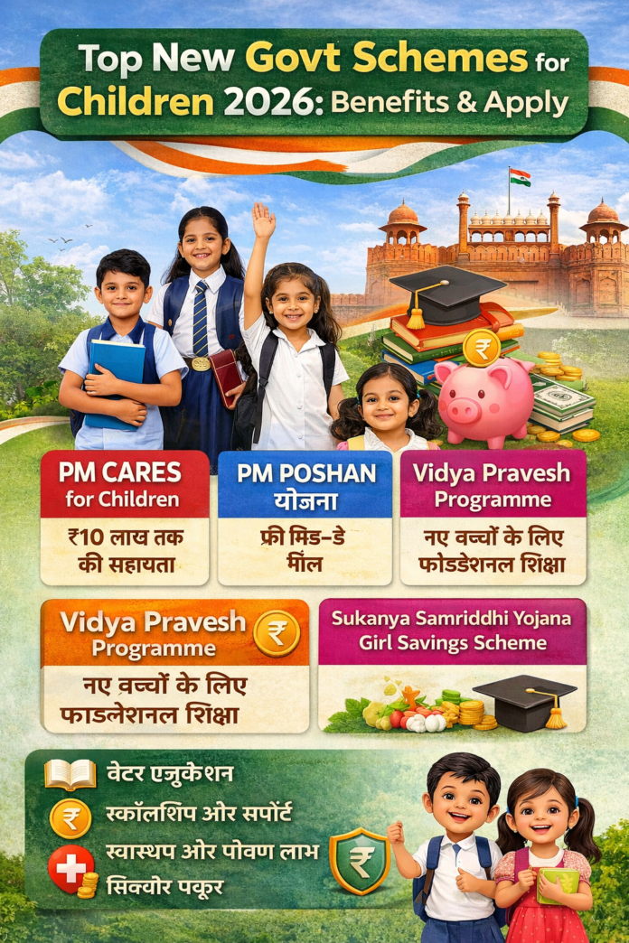 New Govt Scheme for Children:भारत में बच्चों के बेहतर भविष्य के लिए सरकार लगातार नई योजनाएं शुरू कर रही है। साल 2026 में भी कई ऐसी योजनाएं चर्चा में हैं जो बच्चों को शिक्षा, स्वास्थ्य, पोषण और आर्थिक सुरक्षा प्रदान करती हैं।