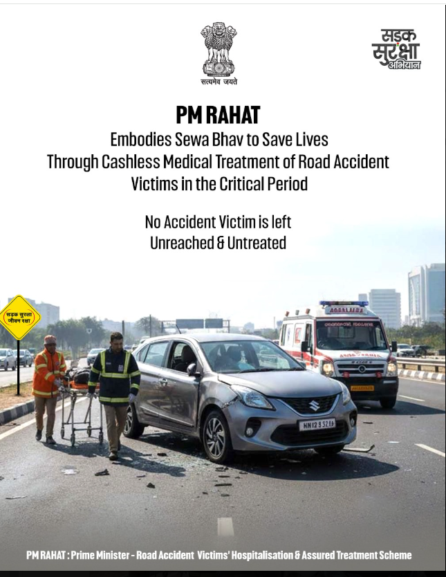 PM-RAHAT योजना के तहत सड़क दुर्घटना के बाद 7 दिन तक कैशलेस इलाज की सुविधा दी जाएगी।